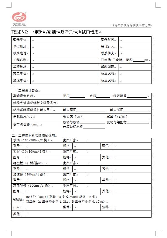 如客戶確定采用本公司系列產(chǎn)品時,請協(xié)助我們做好以下幾項工作:以最快的方式將工程所選用的基材(玻璃/鋁材或復合板)、輔助材料(雙面膠條和泡沫棒)、節(jié)點設計圖紙和相容性申請 表格寄送到我公司客服部或質(zhì)檢部,我們將按有關標準要求進行粘結性、相容性試驗。